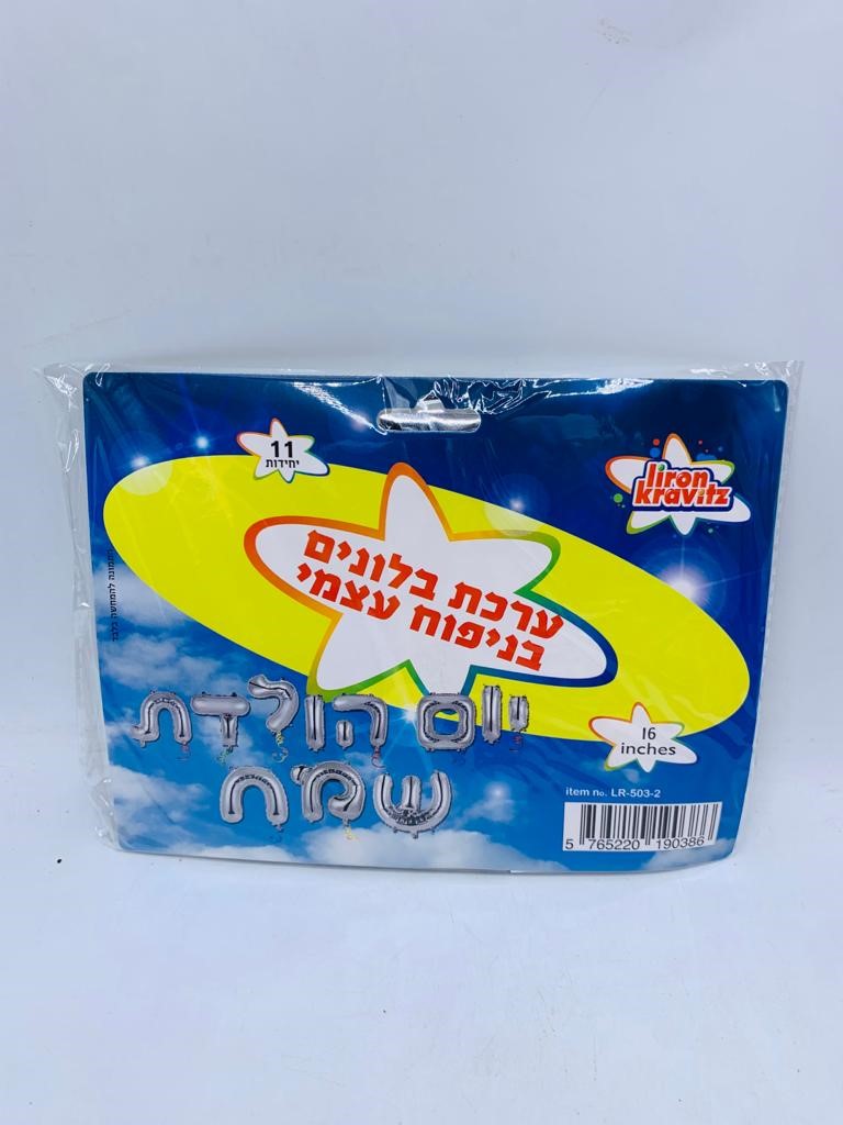 ערכת בלונים כסף יום הולדת שמח בעברית בניפוח עצמי